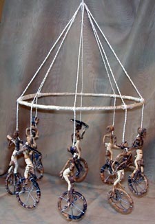 Banana Fiber Unicyclel Mobile - Large Size: Diameter: 8” Height from point where 5 strings meet to bottom of unicycle: 13.5” Length of string to hang from ceiling: approx 20” 5 Figurines on Unicycles: 5” x 2” Weight: 3.9 oz Price: $15.00