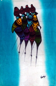 'Home from the Well' Batik Artist: Wango Country of Origin: Kenya Colors: Turquoise, indigo, violet, green and saffron. Size: approx. 25" x 16" Material: Cotton