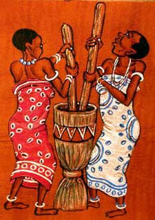 Kenyan Women in Traditional Dress Pounding Maize Artist: the Rastafarian artist Muruka Country of Origin: The barkcloth was made in Uganda and painted by a Kenyan artist. Material: Barkcloth Size: 9" x 11.5" Price: $25