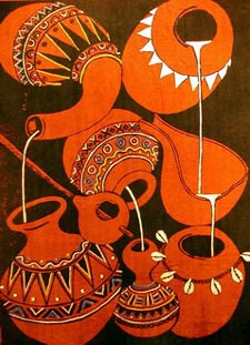 Pouring Gourds Artist: the Rastafarian artist Muruka Country of Origin: The barkcloth was made in Uganda and painted by a Kenyan artist. Material: Barkcloth Size: 12" x 16" Price: $25