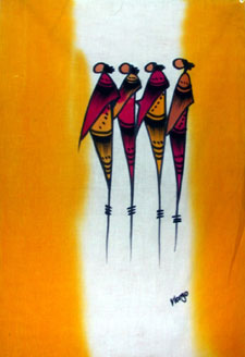 'The Coyness of Youth' Batik Artist: Wango Country of Origin: Kenya Colors: Saffron, raspberry, black. Size: approx. 25" x 16" Material: Cotton
